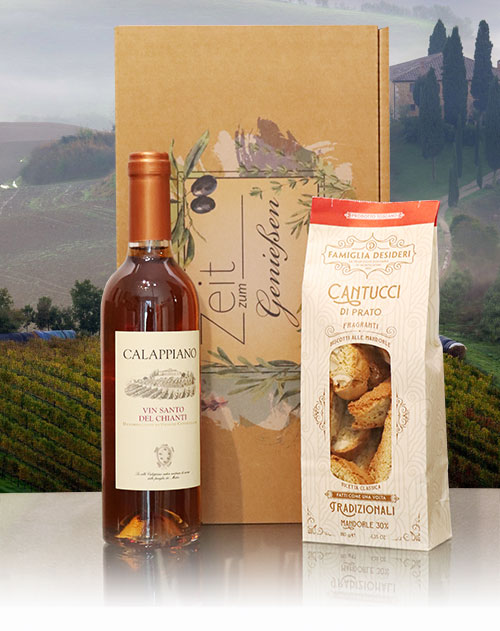 Traditionelles Geschenkset mit Vin Santo del Chianti aus Lamporecchio und Cantucci Golosi (mit Kakao und Haselnüssen) aus Montecatini in der Toskana im schönen Präsentkarton.