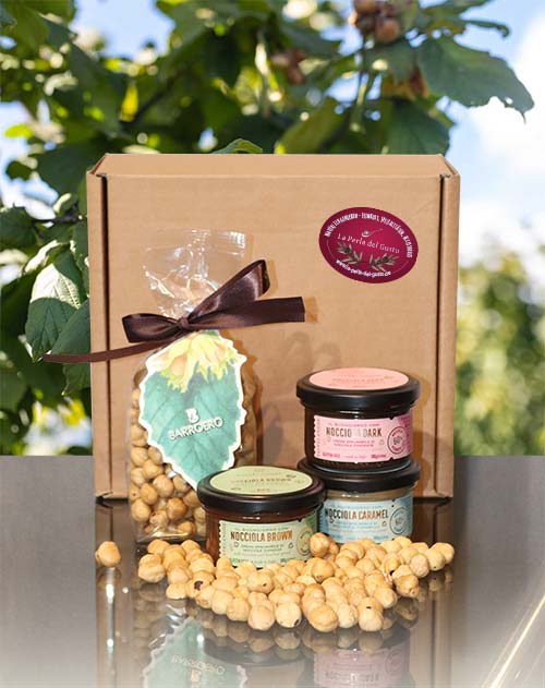 Ein Geschenkset aus drei Haselnusscreme-Variationen von Tastelanghe und frisch gerösteten Haselnüssen IGP von Barroero aus dem Piemont