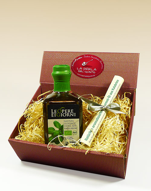 Sortenreines natives Olivenöl extra BIO, natürlich mit Kräutern oder Früchten aromatisiert (250ml) im Präsentkarton.