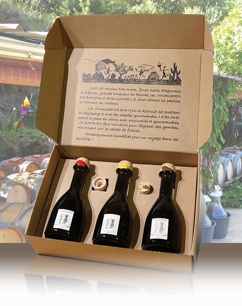 Vinaigre de Muscat, Vinaigre de Banyuls Rouge & Vinaigre de Banyuls mit Safran von La Guinelle aus Südfrankreich
