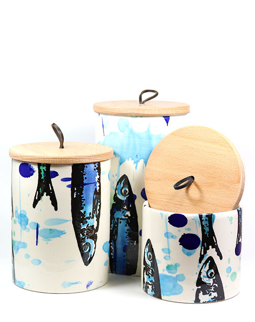 Sehr schönes Set aus drei Keramik-Dosen (0,7 Liter, 1,0 Liter u. 1,7 Liter) mit schönem Holzdeckel