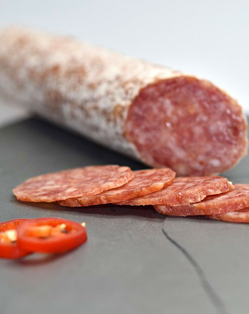 Luftgetrocknete Salami vom Eichelschwein aus der Waldweide, verfeinert mit Piment d´Espelette