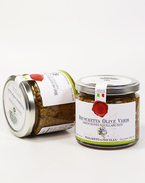 Bruschetta mit grünen Oliven, Gewürzen und Meersalz (Sizilien). Einfach herrlich auf geröstetem Baguette