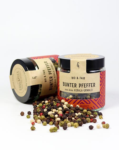 Edler bunter Pfeffer mit einem vielschichtigen Geschmack. 100% natürlicher Bio-Ursprung mit fairem Lohn für die lokalen Landwirte.