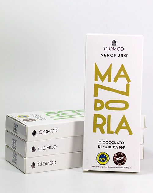 Kalt zubereitete Schokolade aus Modica (Sizilien), mit braunem Zucker und Mandeln.