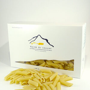 Regina dei Sibillini - PenneDie „Azienda Regina dei Sibillini“ produziert Nudeln nach handwerklichem Verfahren: die Pasta wird durch Bronze gezogen und dann bei niedrigen Temperaturen schonend getrocknet. Es wird nur Weizen verwendet, der in Höhen von 600 bis 900 m Meereshöhe in Mitten des Nationalparks Monti Sibillini angebaut wurde.