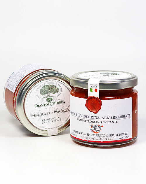 Das Feuer und die Leidenschaft Siziliens im Glas. Ein feurig-fruchtiges rotes Pesto, das die Familie Cutrera nur aus den besten landestypischen Zutaten zaubert und mit Ihrem eigenen erstklassigen Olivenöl cremig verfeinert. Es passt hervorragend auf geröstetem Brot (Bruschetta) und ist großartig zu Pasta und Gegrilltem. Aber auch toll zum Würzen geeignet – geben Sie einen kleinen Klecks in eine Soße oder einem Dip, für den letzten Kick. Lecker und scharf-würzig.