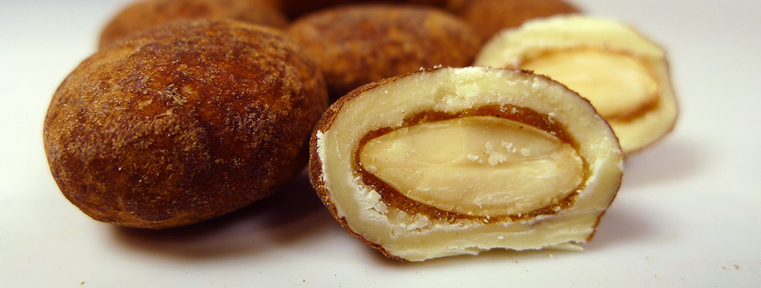 Geröstete, karamellisierte Marcona-Mandeln aus Spanien. Ummantelt von Milchcreme und in Kakao gewälzt.