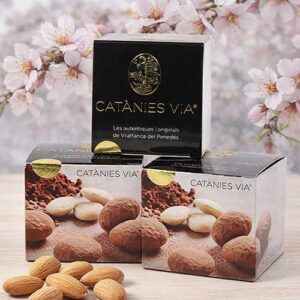 Im kleinen Örtchen Vilafranca del Penedès in Katalonien (Spanien) entsteht eine exquisite, sehr traditionelle katalonische Spezialität: die Catánies Via! Das sind karamellisierte Marcona-Mandeln, die von einer Schicht aus cremiger weißer Schokolade umhüllt sind und anschließend in Kakao gewälzt werden.