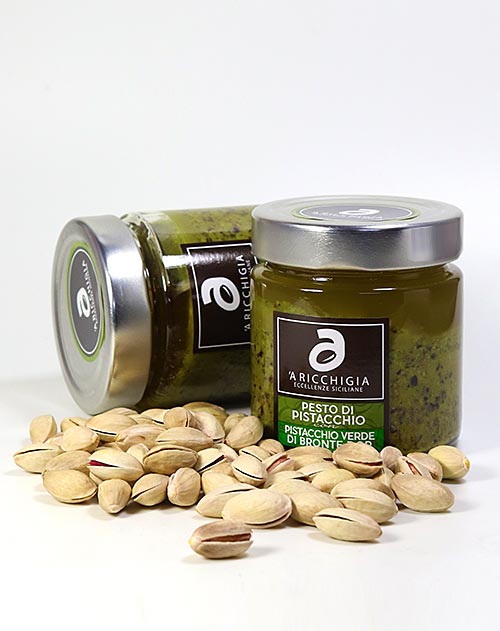 Eines der kostbarsten Erzeugnisse Siziliens wird hier zu einem herrlichen Pesto verarbeitet: Die berühmten Bronte-Pistazien! Dieses Pistazien-Pesto aus Bronte-Pistazien (DOP) ist ein wahrer Gaumenschmaus und gehört zu den edelsten Pesti überhaupt. Natürlich ganz herrlich zu einer guten Pasta, aber auch sehr fein zu Fisch, Meeresfrüchten und Geflügel.