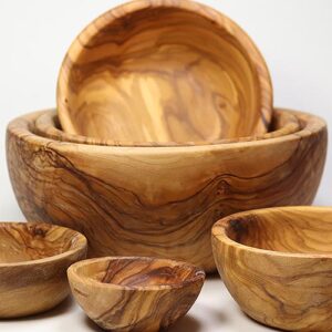 Dieses schöne Set aus sechs Schalen aus wunderschön gemasertem Olivenholz wurde im italienischen Foligno (Umbrien) liebevoll von Hand gefertigt. Die sechs Schüsseln im Durchmesser von 5 – 17 cm passen perfekt zusammen und sind ein Zierde jeder Tafel. Platzsparend auch ineinander stapelbar.