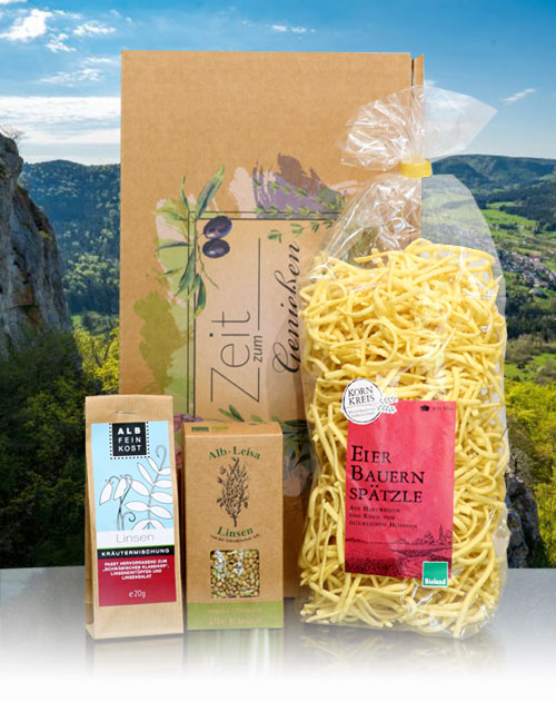 Preis je Geschenkset (250g BIO Linsen, 500g BIO Spätzle, 20g BIO Kräutermischung, Geschenkbox)