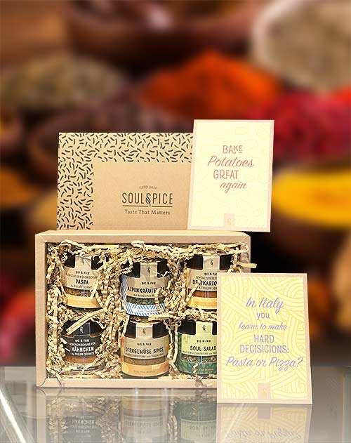 Sechs hochwertige Gewürze für die schnelle Küche von SoulSpice aus Bayern. BIO-zertifiziert und aus fairem Handel