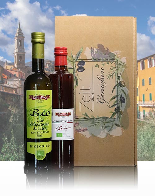 Bio Rotwein-Essig aus dem Holzfass und ein fruchtig-mildes Bio Natives Olivenöl Extra aus Ligurien im Präsentkarton: