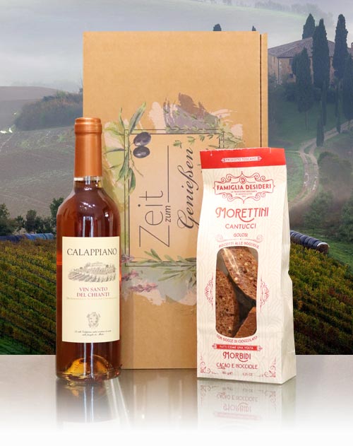 Traditionelles Geschenkset mit Vin Santo del Chianti aus Lamporecchio und Cantucci Golosi (mit Kakao und Haselnüssen) aus Montecatini in der Toskana im schönen Präsentkarton.