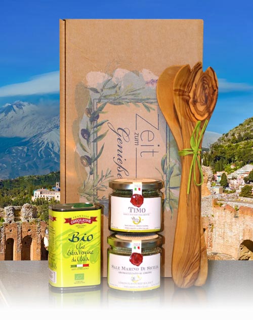 Sortenreines natives Olivenöl extra BIO, natürlich mit Kräutern oder Früchten aromatisiert (250ml) im Präsentkarton.