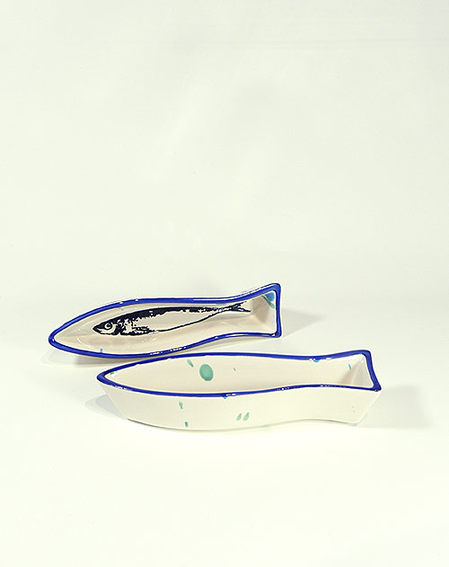 Keramik-Schale Fischform 16 x 4 cm Sardinen-Motiv, Rand gelb, ofenfest (Portugal)Keramik-Schale Fischform 26 cm Sardine-Motiv ohne Kleckse, ofenfest (Portugal)