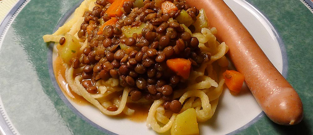 Das Basisrezept für ein schwäbisches Grundnahrungsmittel. Zutaten für die Linsen: Zutaten Spätzle-Teig: Zubereitung der Linsen Die Linsen für ca. 25 Minuten in ungesalzenem Wasser garen. Nach Belieben kann auch Suppengemüse mitgekocht werden (s. Foto). Aus einem halben EL Butter, einem EL Mehl und einer kleinen, fein gehackten Zwiebel eine Mehlschwitze herstellen und in die Linsen