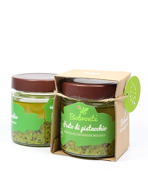 Ein köstliches Pesto aus Bronte-Pistazien (DOP), Öl, Salz und Pfeffer, glutenfrei, laktosefrei.