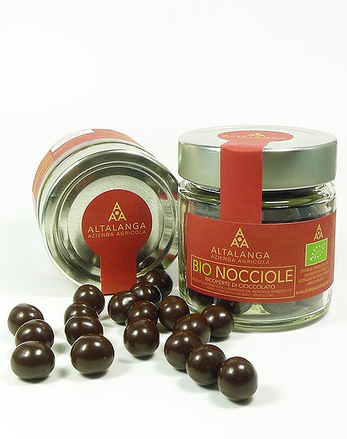 BIO Haselnüsse, überzogen mit BIO Zartbitter-Schokolade von Altalanga aus dem Piemont.