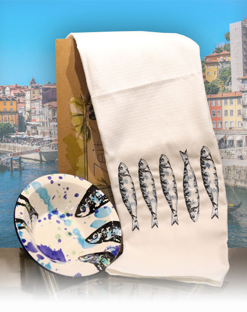 und einer handbemalten Keramikschüssel mit Sardinen-Motiv und Farbtupfern aus Lissabon (Portugal)