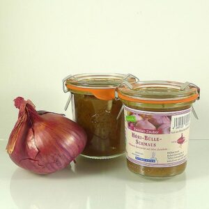 Ein wahrer Gaumenschmaus ist diese süßsaure Spezialität mit der Höri-Bülle (Zwiebel) vom Bodensee. Hier wird diese ursprüngliche Knolle mit Apfelsaft, Apfel-Balsamessig, Apfelessig und frischem Thymian eingemacht. Der Höri-Bülle-Schmaus schmeckt wunderbar zu Gebratenem, zu Käse- und Fleischgerichten oder auch als kalte Beilage zu Käse- und Wurstspezialitäten.