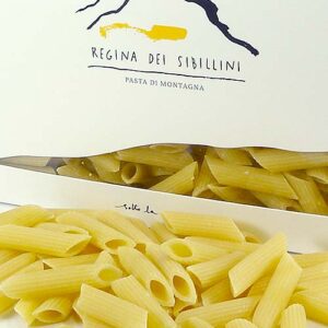 Regina dei Sibillini - PenneDie „Azienda Regina dei Sibillini“ produziert Nudeln nach handwerklichem Verfahren: die Pasta wird durch Bronze gezogen und dann bei niedrigen Temperaturen schonend getrocknet. Es wird nur Weizen verwendet, der in Höhen von 600 bis 900 m Meereshöhe in Mitten des Nationalparks Monti Sibillini angebaut wurde.