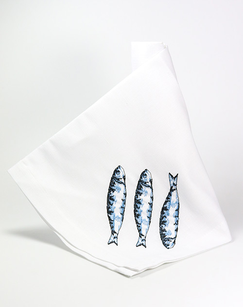 Stoff-Serviette mit handgesticktem Sardinen-Motiv