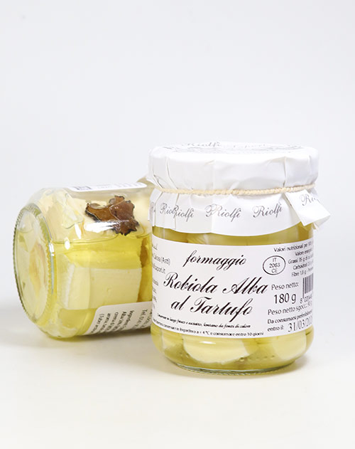 Der Robiola d´Alba ist eine typische Käsespezialität aus der Provinz Cuneo (Piemont). Der aus Kuhmilch hergestellte Käse wird in Würfel geschnitten, gewürzt und in einem Glas mit bestem Olivenöl eingelegt. Unser Formaggio Robiola d´Alba al tartufo mit schwarzem Trüffel passt hervorragend zu Vorspeisen, Hauptgerichten und zur traditionellen, mediterranen Käseplatte nach dem Essen oder genießen Sie ihn einfach auf geröstetem Brot.