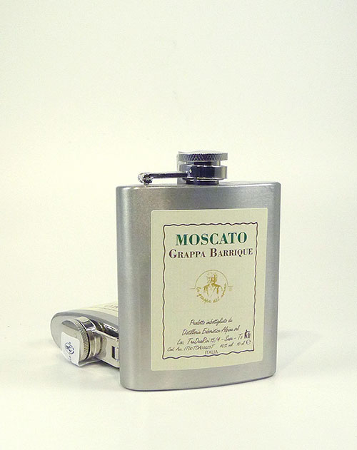 Nicht nur ein hochwertiger Barrique-Grappa, sondern auch eine nette Geschenkidee: der exclusive Grappa im Edelstahl-Flachmann hat schon so manchem Wanderer an kühlen Herbsttagen die Seele erwärmt.