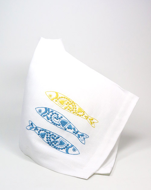 Stoff-Serviette mit handgesticktem Sardinen-Motiv