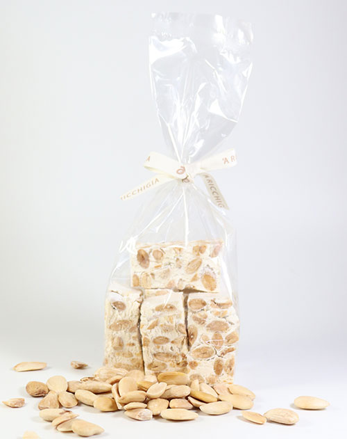 Genießen Sie ein herrlich weiches Mandel-Nougat aus Sizilien! Das mit Zucker und Honig cremig aufgeschlagene Eiweiß ist vermengt mit besten, gerösteten sizilianischen Mandeln. Ideal zum Verschenken oder selbst naschen. Das weiche sizilianische Nougat ist es ein echtes Geschmackserlebnis.
