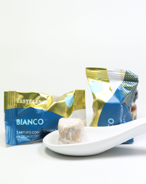 Die berühmten „Tartufi dolci“ aus dem Piemont sind kleine Meisterwerke. Nicht weniger als 24 Stunden benötigt man, um diese Köstlichkeit zu fertigen. Dabei ist es entscheidend, welchen Röstgrad die piemonteser Haselnüsse haben und dass nur beste Haselnusspaste und feinste Schokolade zum Einsatz kommen. Diese drei Zutaten werden zum richtigen Zeitpunkt vereint und zwischendurch immer wieder gekühlt. Nur so ensteht die unvergesslich cremige Konsistenz und das feine Aroma der Tartufi dolci. Alberto von Tastelanghe presst die zart schmelzende Masse dann durch einen Extruder und schneidet sie in gleiche Stücke. Danach werden Sie mit Kakao oder Puderzucker bestäubt.