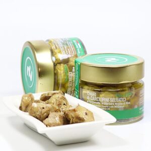 Die wilden Artischocken aus Süditalien sind eine echte, traditionelle Rarität. Die Cuori di Carciofini selvatici sind kompakt und nehmen deshalb auch das Olivenöl nicht so auf, wie man das sonst von eingelegten Artischocken kennt. Deshalb sind sie auch im Biss schön fest. Diese zierlichen kleinen Artischocken werden, nachdem sie in reiner Handarbeit sehr aufwendig geputzt wur- den, gemäß dem Familienrezept in nativem Olivenöl extra mit ein wenig Weinessig aromatisch eingelegt.